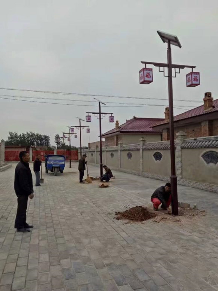 簡介—— 甘肅省慶陽市西峰區太陽能庭院景觀燈工程,采購了我們蘭光照明倆種形式的配套組合景觀燈具,采用單板雙頭20W,中國福燈籠造型,燈體主體采用深棕色配中國紅,配合3.5米高中國紅庭院柱燈,相互照應配合,使得整體景區體現出濃濃的喜慶特色。