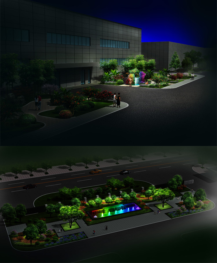 彩虹廠夜景照明設計,是結合廣場噴泉景觀,廣場樹木以及草坪的亮化,設計主要采用彩色燈光和暖色白光為主,中心已白光打亮整個廣場,照明路面,周邊樹木圍欄周圍采用線條燈勾勒出輪廓,在用照樹燈給樹木打亮,是廣場的夜晚更加璀璨。