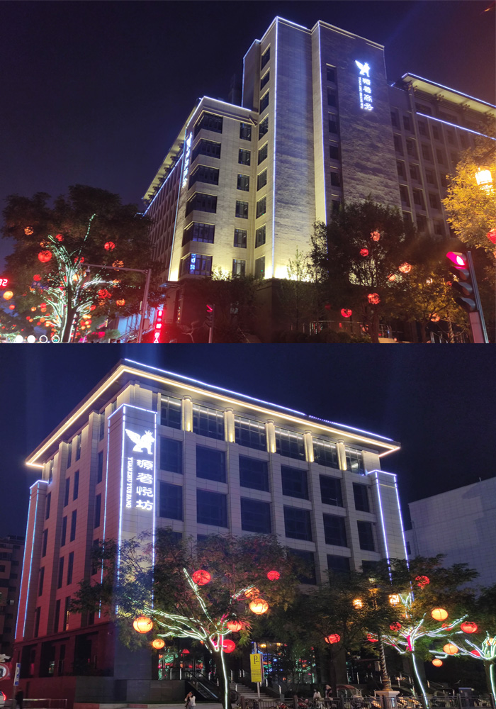 簡介—— 陜西西安曲江源著項(xiàng)目位于西安市雁塔區(qū),比鄰大雁塔,是公寓住在,周邊配套完善。該項(xiàng)目是我是2021年9月開始施工的項(xiàng)目,主要是對公寓樓做線條勾勒,將建筑的主體效果體現(xiàn)出來,樓頂采用的是線條勾勒以及頂部打亮,整體體現(xiàn)出簡潔大氣的夜景亮化效果。